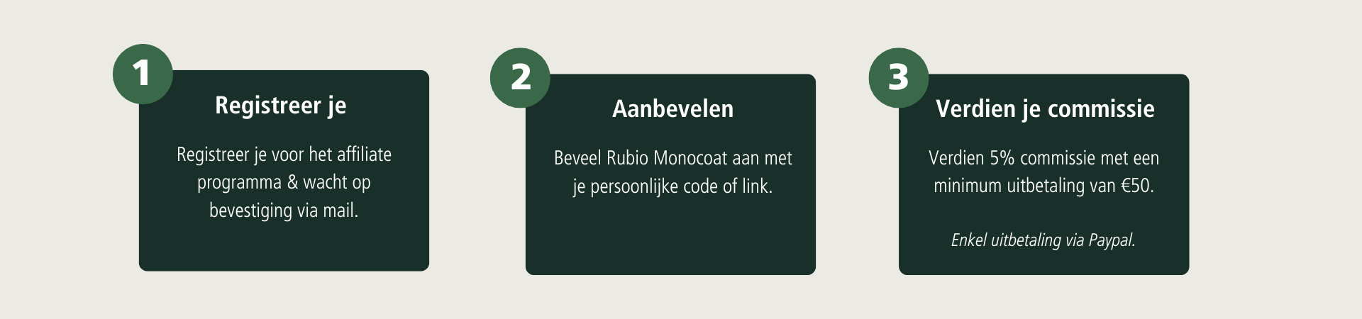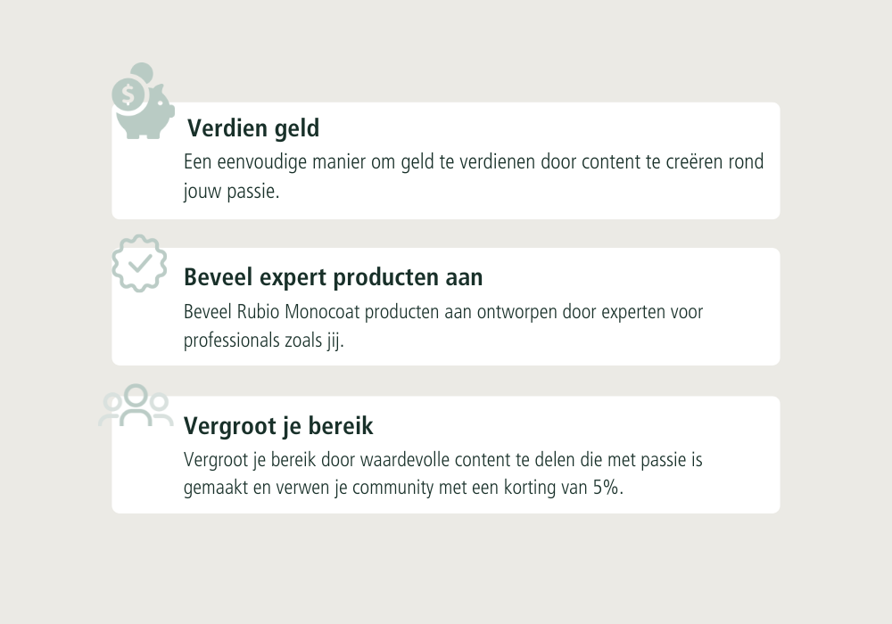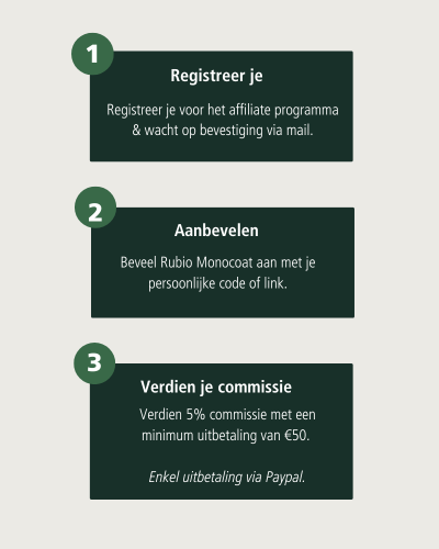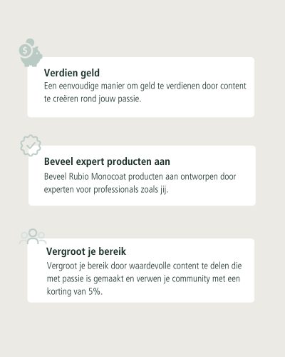 Jouw code kan bijvoorbeeld ook door jouw buitenlandse volgers gebruikt worden op de officiële Rubio Monocoat webshop van hun land.