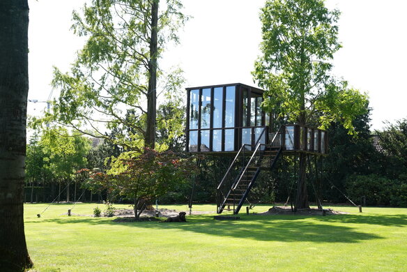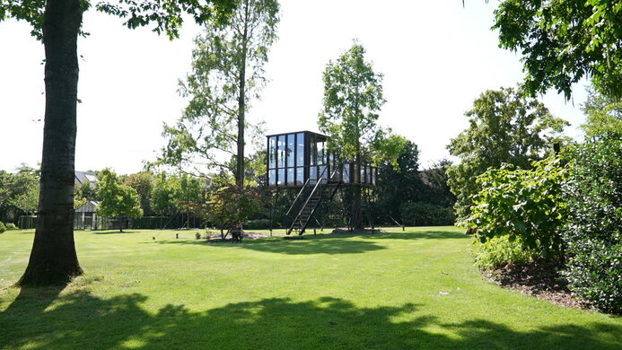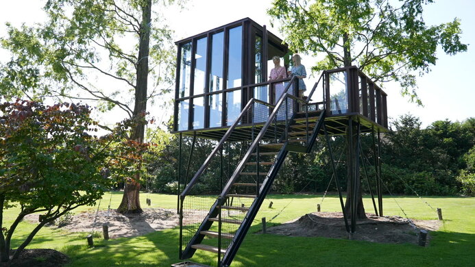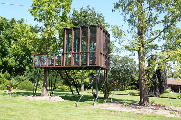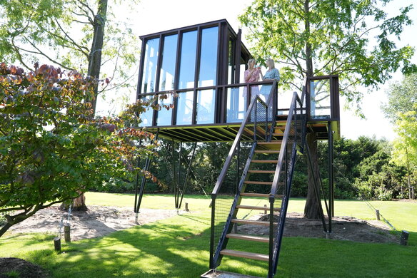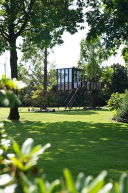 Dat is nog eens een verfijnde interpretatie van een kinderklassieker! HogerHuis ontwierp dit moderne, verhoogde ontwerp en maakte het met Afzelia hout. Het project heeft langs alle kanten ramen van vloer tot plafond en tilt een conventionele boomhut naar nieuwe hoogten!