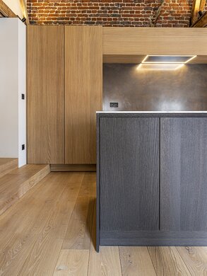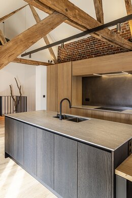 De vloeren en natuurlijke delen van de keuken werden behandeld met Oil Plus 2C in de kleur Smoke 5%. De donkere kasten van het kookeiland zijn behandeld met Precolor Easy (een mix van de kleuren Mystic Brown & Clear) en Oil Plus 2C Black.