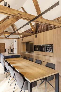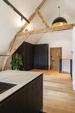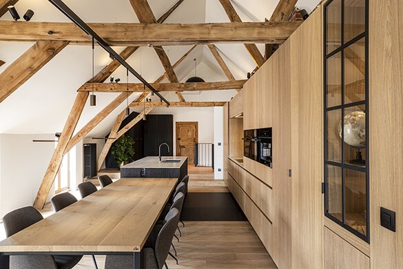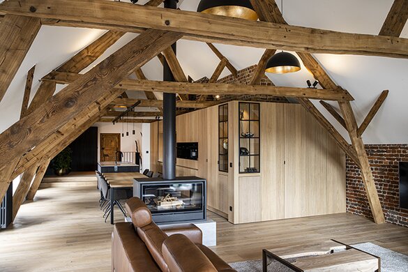 Voor dit project was het belangrijk om de authentieke elementen te benadrukken en te behouden. Zo bleven de oude schouwen van de voormalige cichoreifabriek zichtbaar in dit gebouw, net als de oude muurprofielen en dakgebinten. Deze ruimte was tot nu toe nooit bewoond, wat het extra bijzonder maakt.