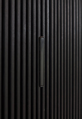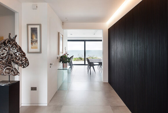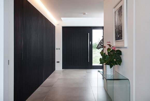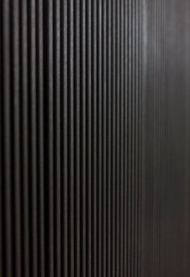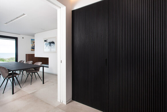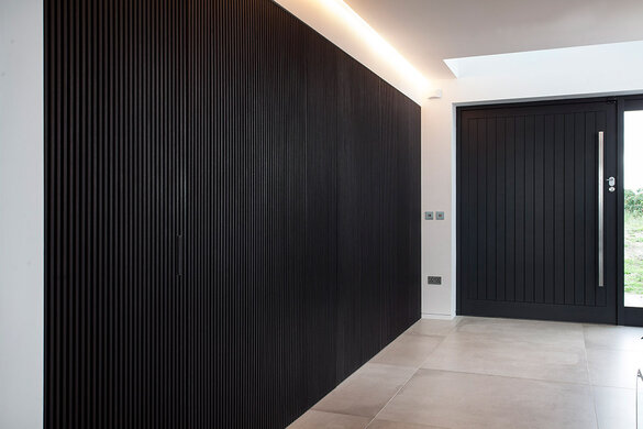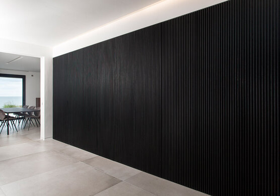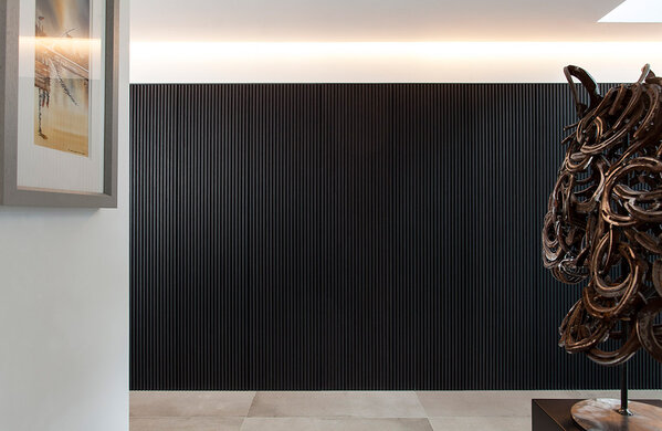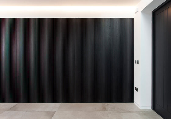 De zwart gekleurde eiken lattenpanelen zijn opbergruimte voor de hal. Er zit ook een verborgen deur in de lambrisering die naar een ander deel van het huis leidt. De afwerkingen hiervoor zijn Precolor Easy in Intense Black en Oil Plus 2C in Charcoal.