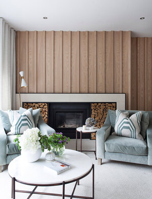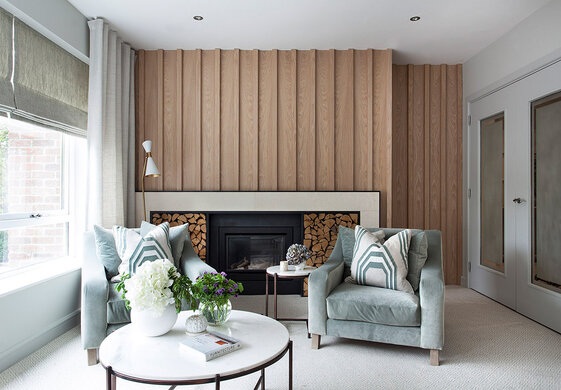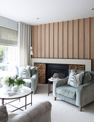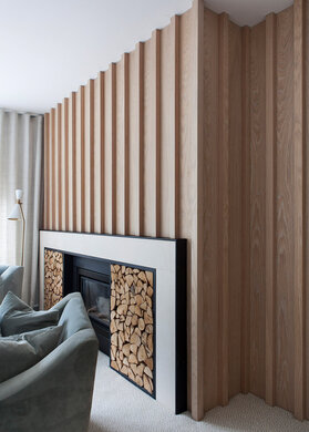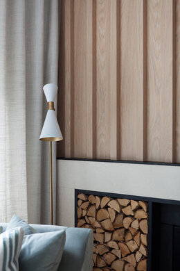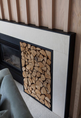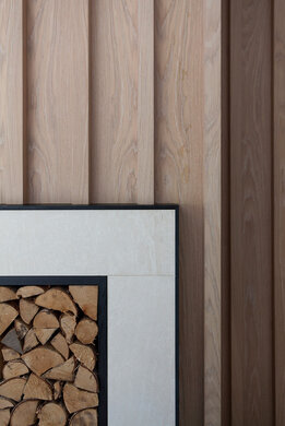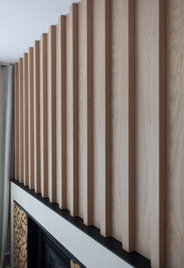 Voor de open haard hebben ze grote eiken latten toegevoegd rond een bestaande haard, samen met natuursteen. Ze bevestigden ook gehakte houtblokken aan weerszijden van de muur, zodat het leek alsof er houtblokken lagen opgeslagen voor het vuur. Voor de lambrisering werd Oil Plus 2C in de kleur Naturel op eik gebruikt.